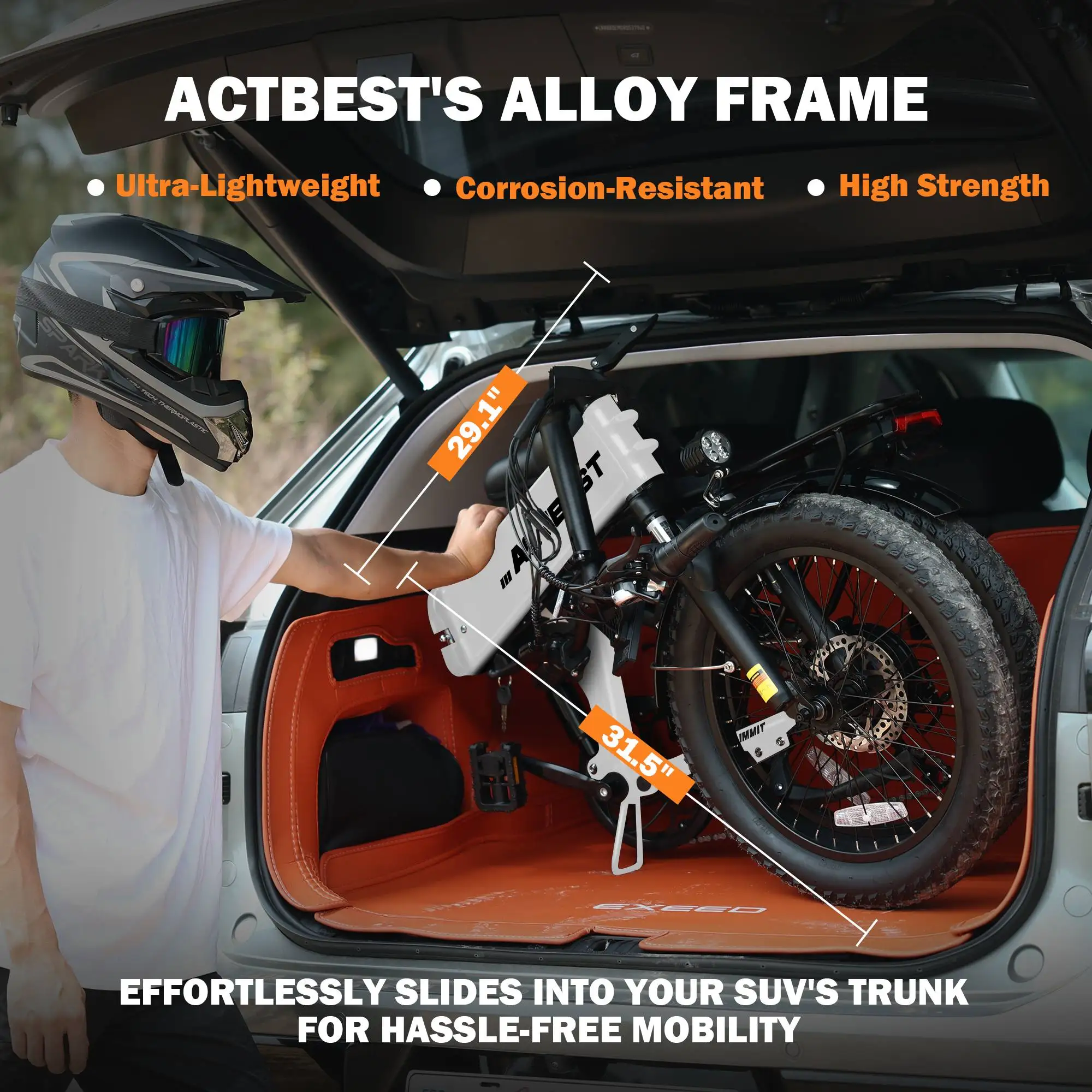 The Summit folding electric bike easily fits into the trunk of your SUV for on-the-go convenience, making it perfect for quick jaunts or long-distance explorations.