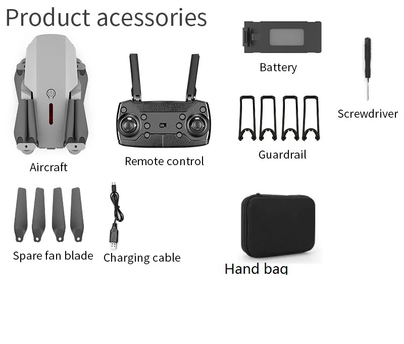 Function: Up/down, Forward/backward, Turn left/right, Sideward flight, 3-level flight speed, LED Light, Headless Mode, One Key Automatic Return, Altitude Hold Mode, WiFi FPV, Trajectory Flight, Camera/Video